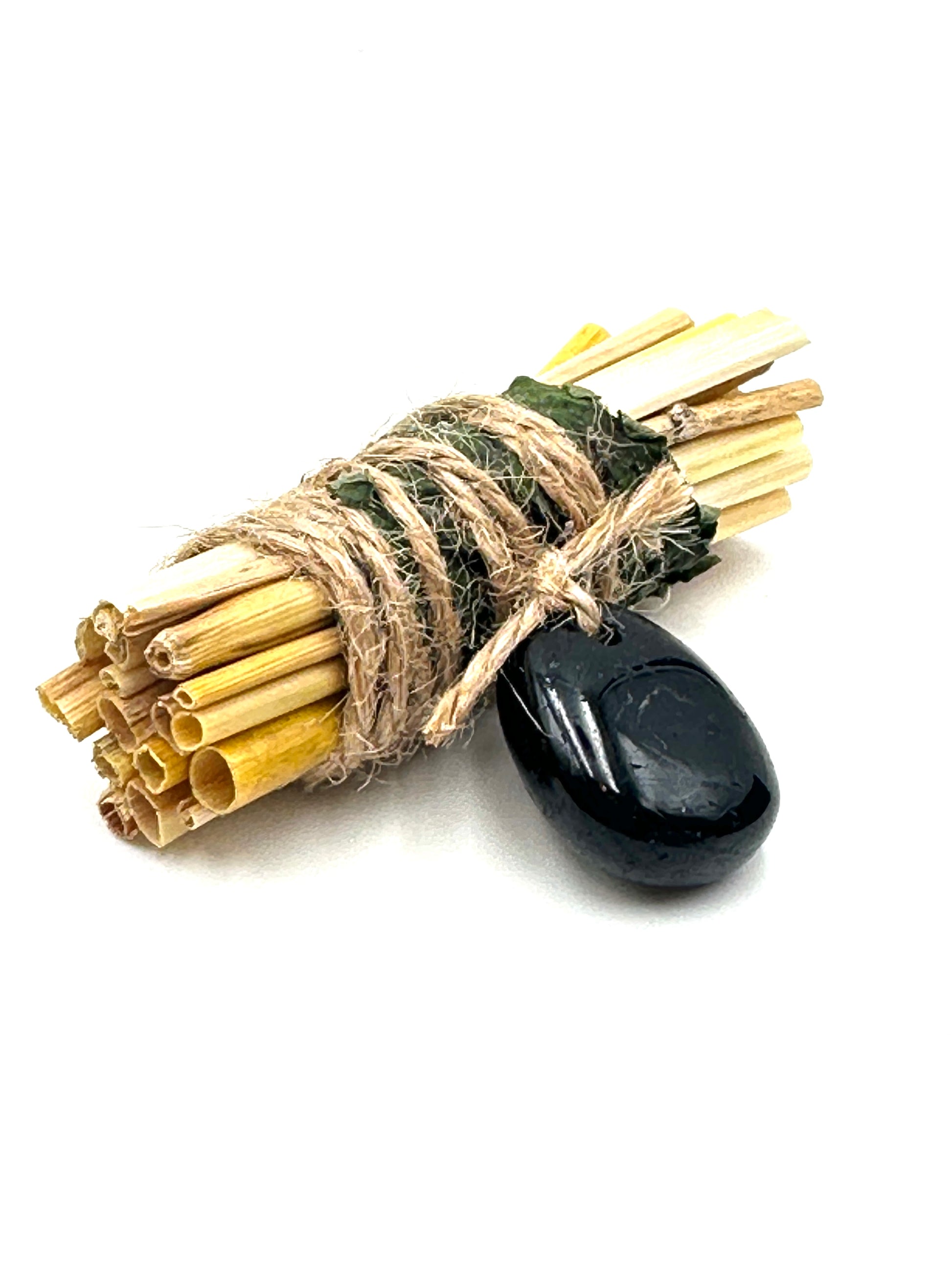 Ramillete de heno, melisa y turmalina negra: un talismán para tu hogar que mantiene alejadas las influencias oscuras.
