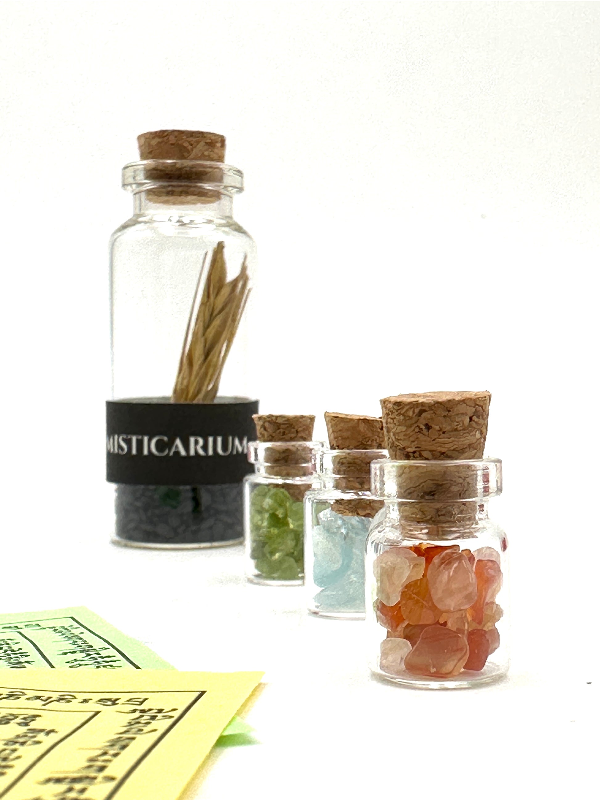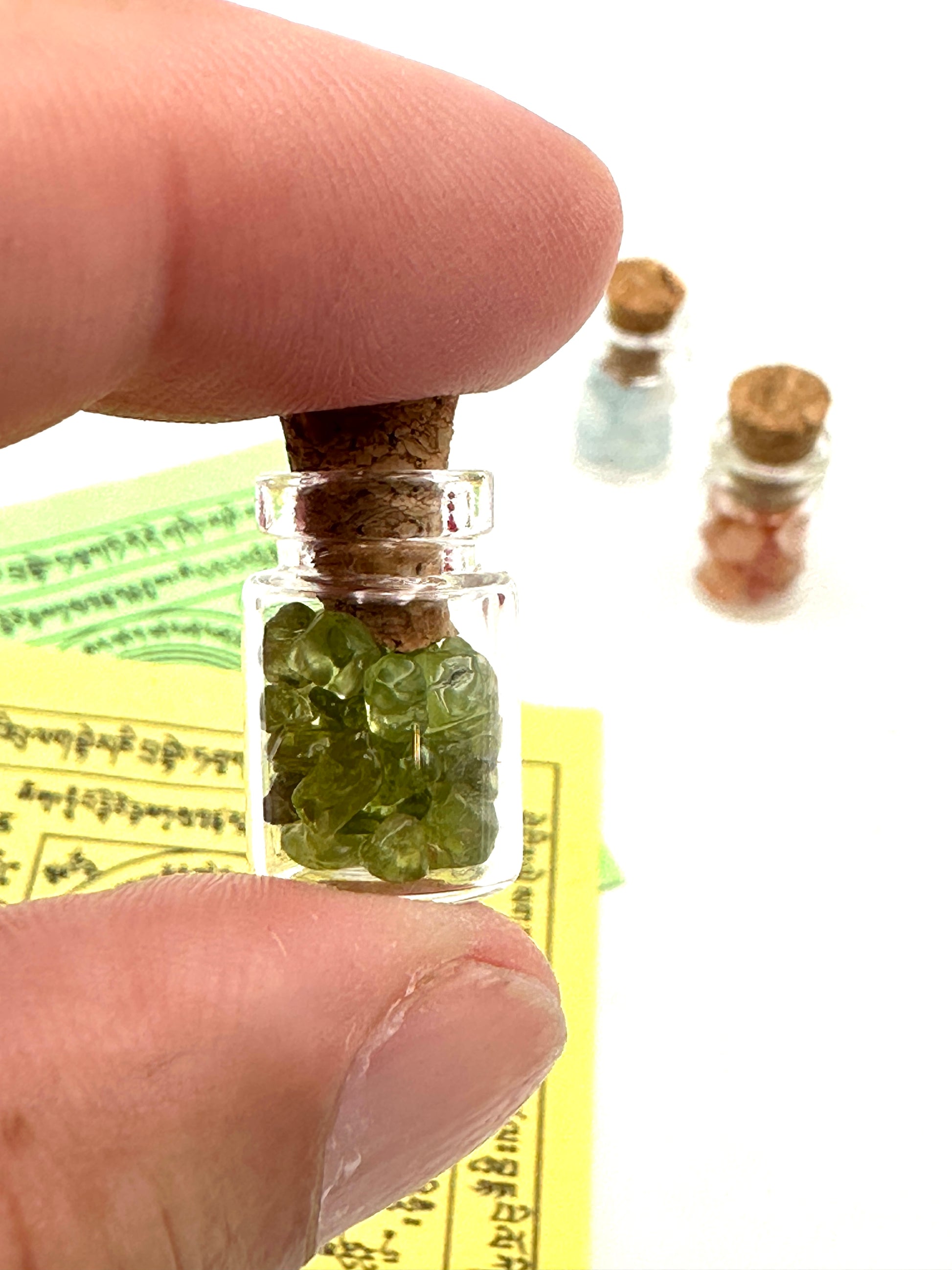 Olivino: con la botellita entre tus manos, di tres veces: “Tres veces atraigo abundancia”. Vierte las piedras en la botella con semillas.
