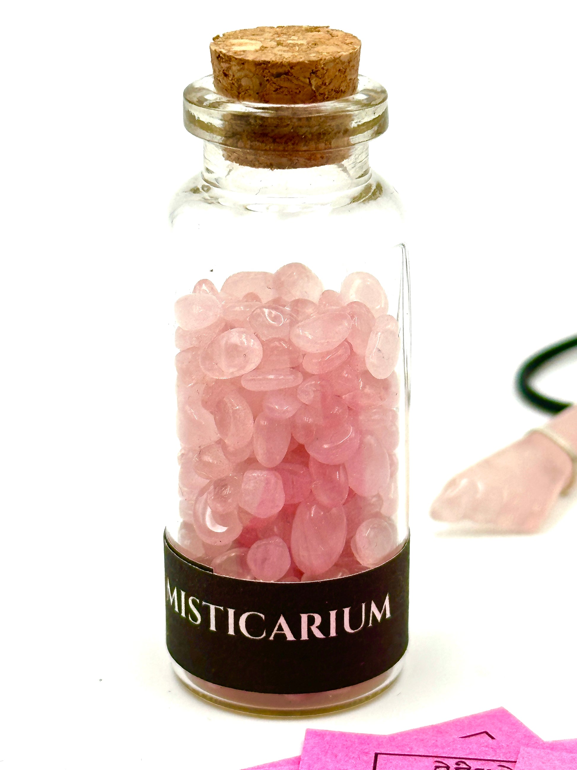Botella con piedras de cuarzo rosa: cada una potencia tu intención amorosa.