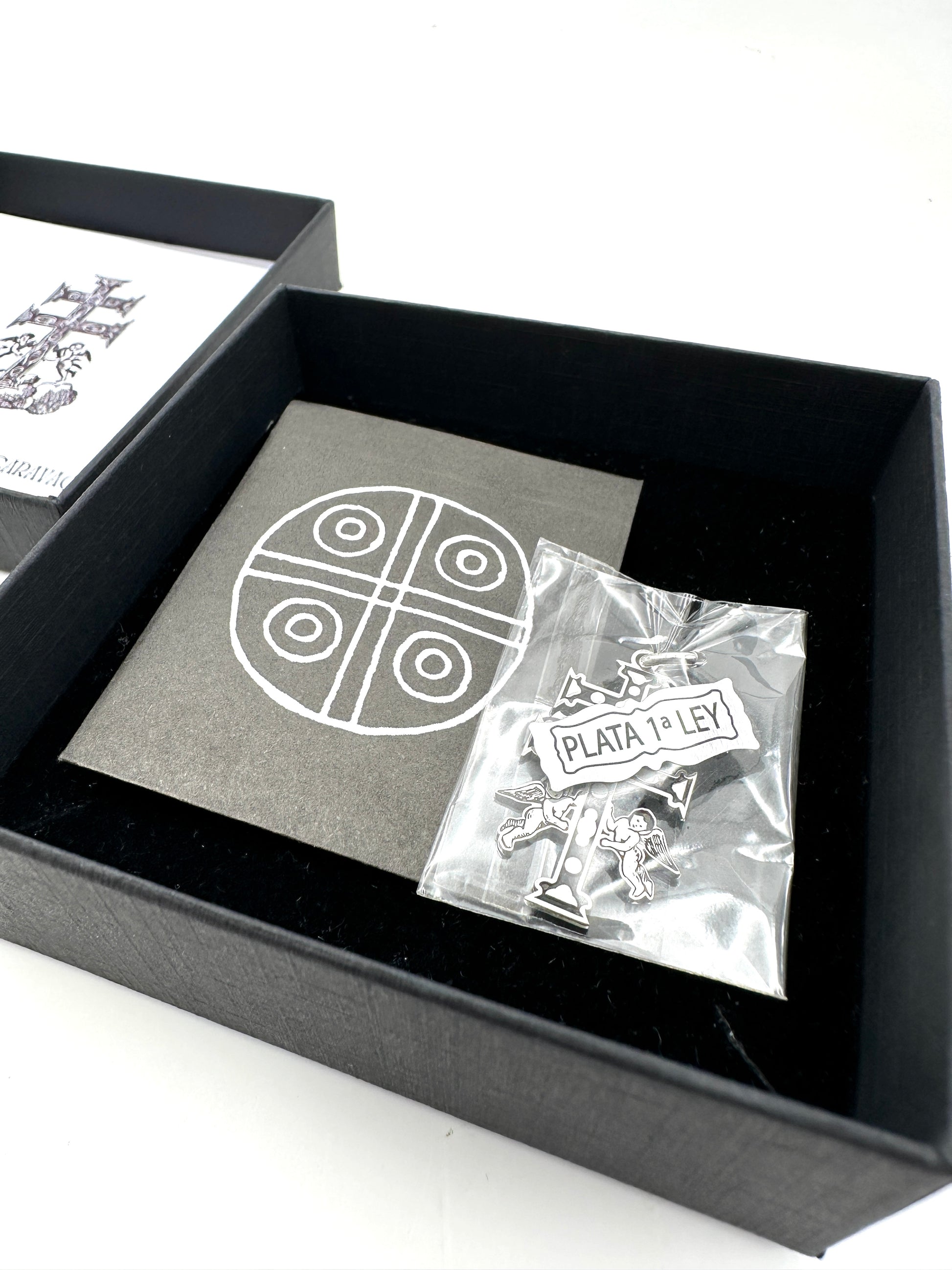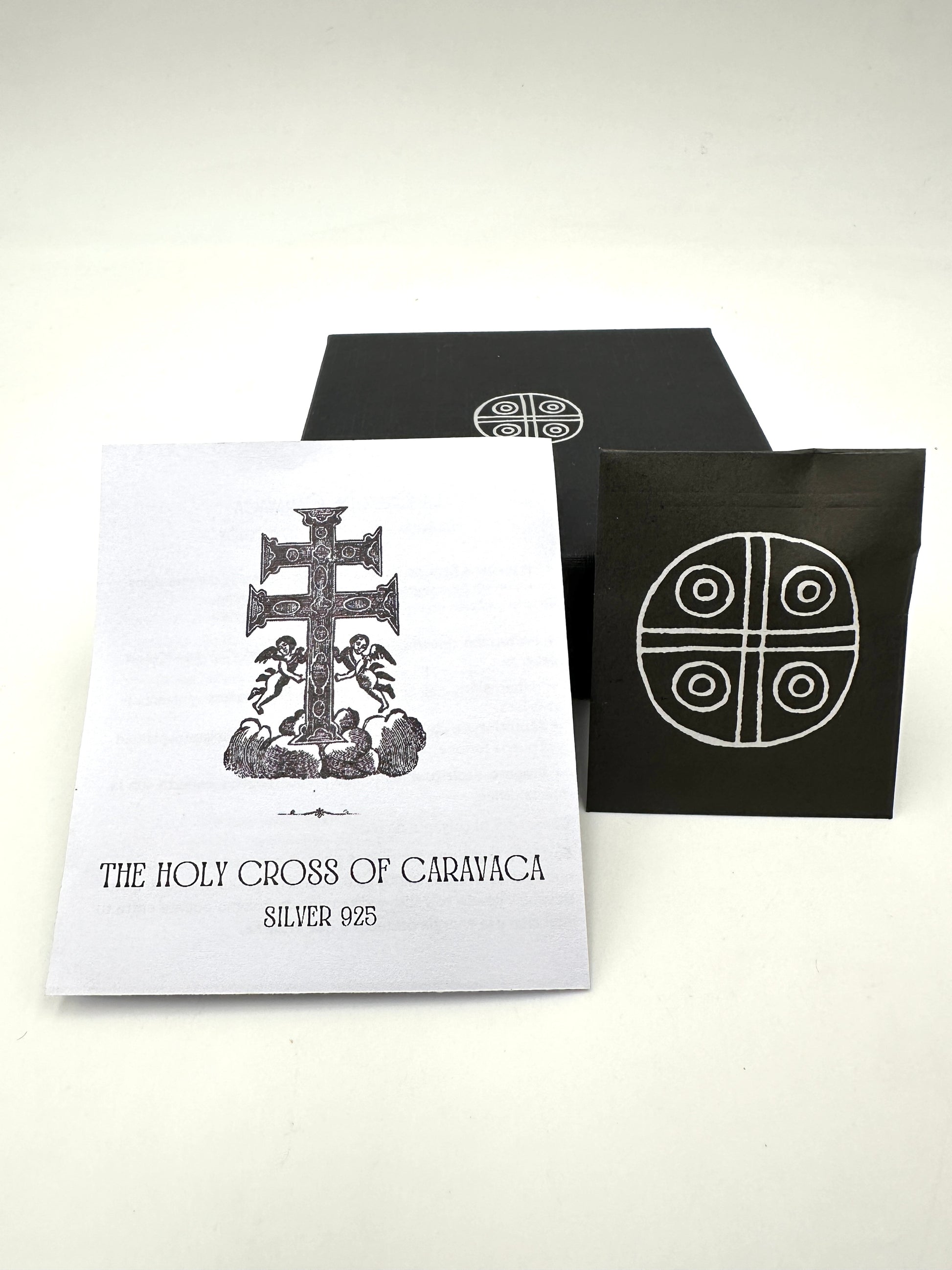 Reproducción en plata de la legendaria Cruz de Caravaca, inspirada en la ilustración del libro antiguo “Tesoro de milagros y oraciones de la SS Cruz de Caravaca”.